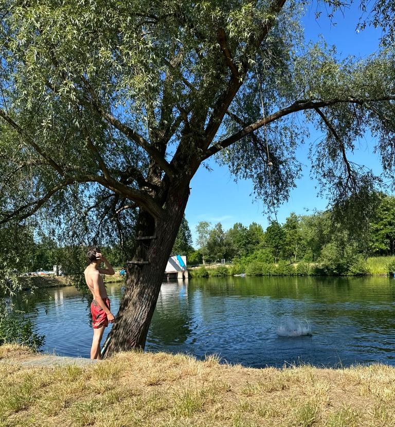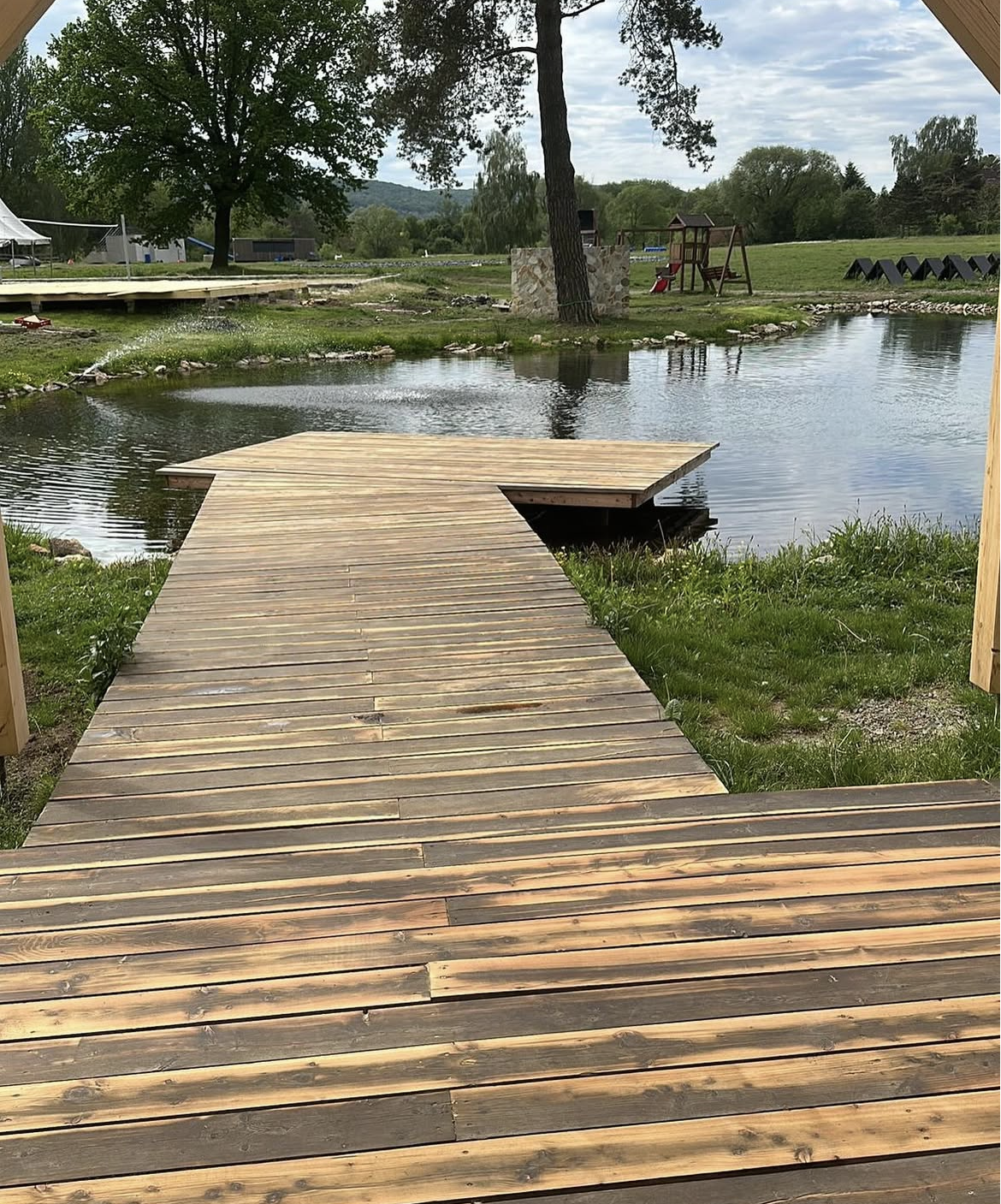 Součástí areálu je také umělé přírodní jezírko s hloubkou až 180 cm, vybavené molem a pozvolným vstupem do vody, které nabízí bezpečné a pohodlné koupání pro všechny věkové skupiny.